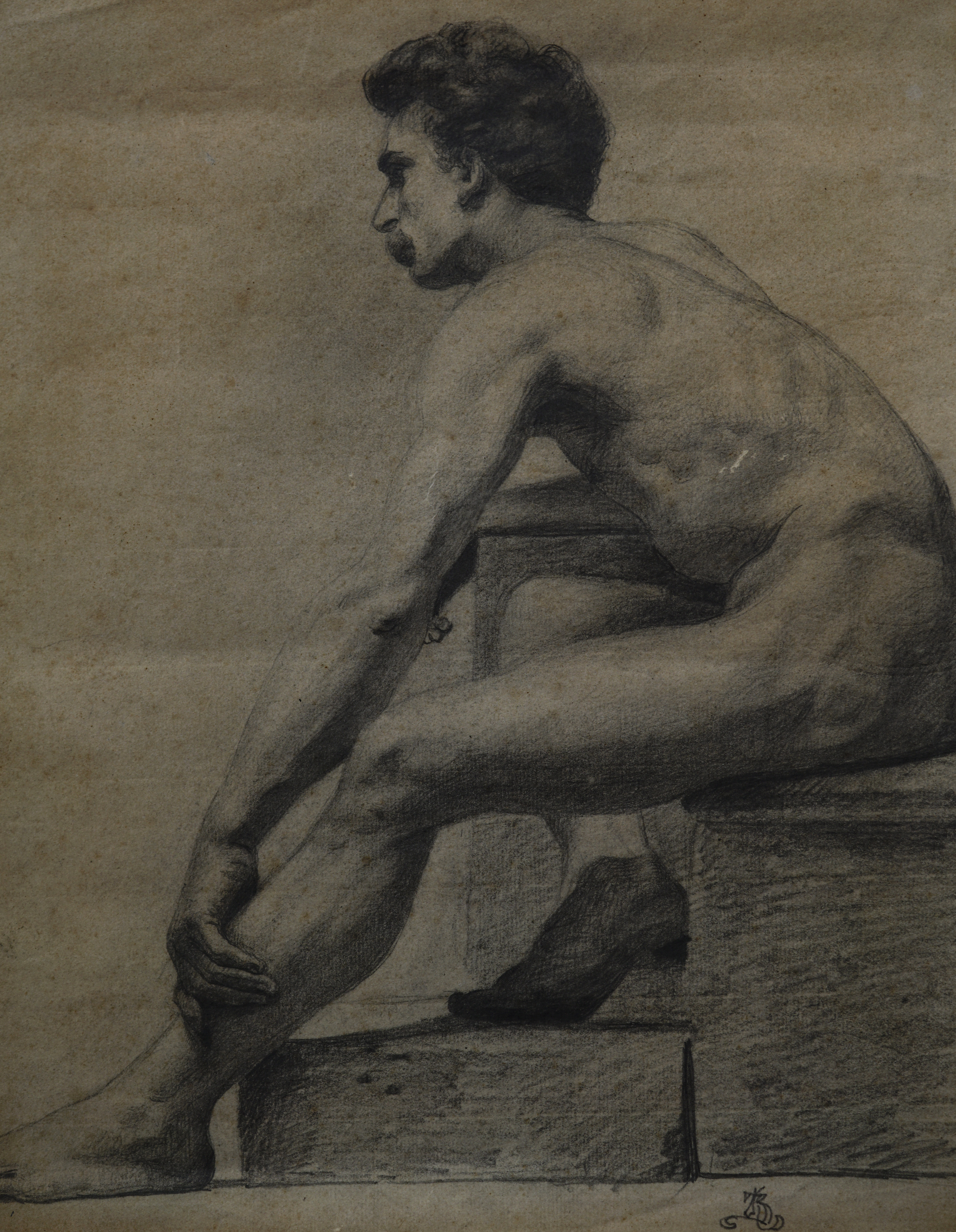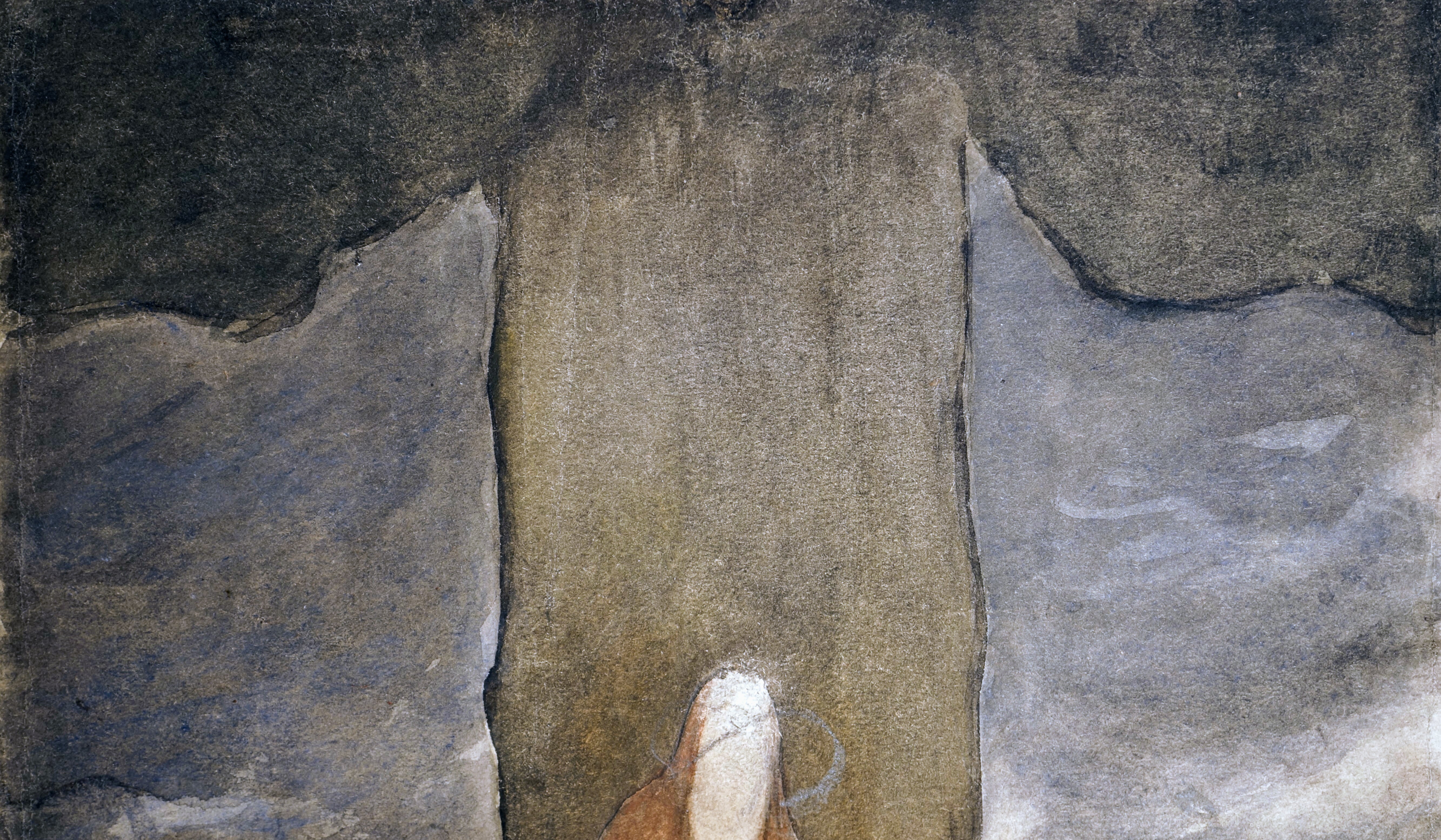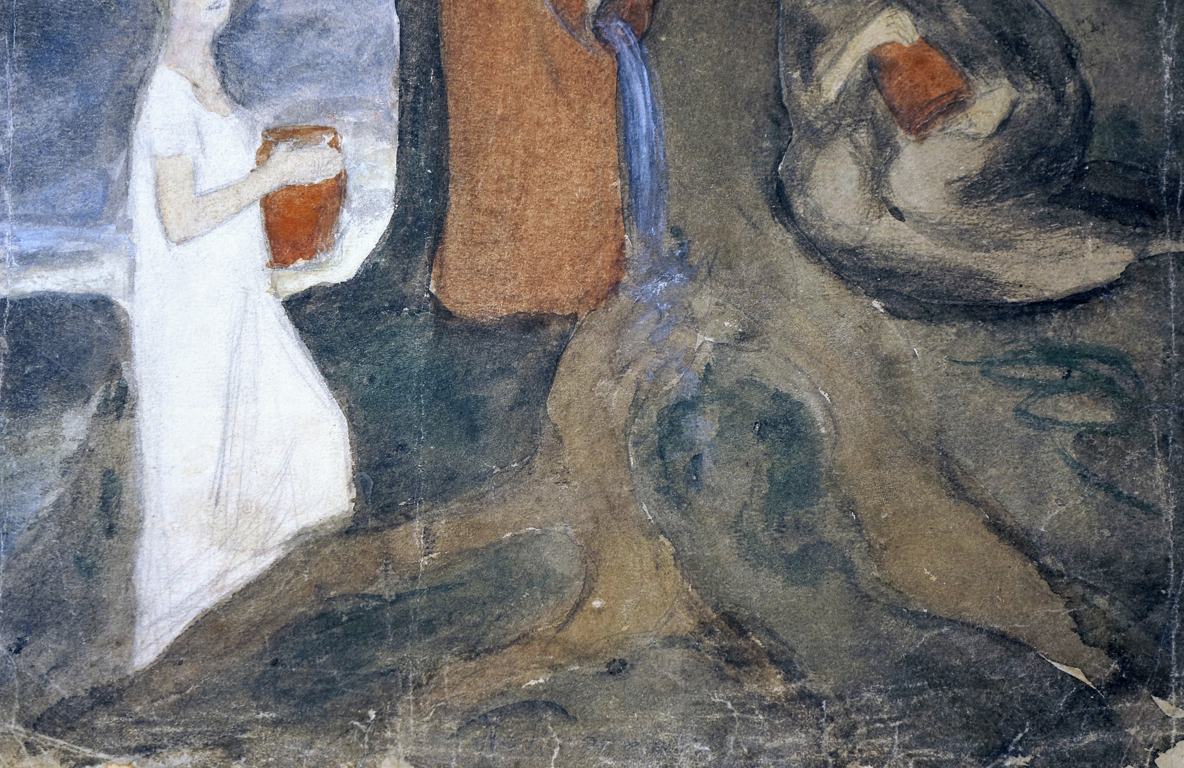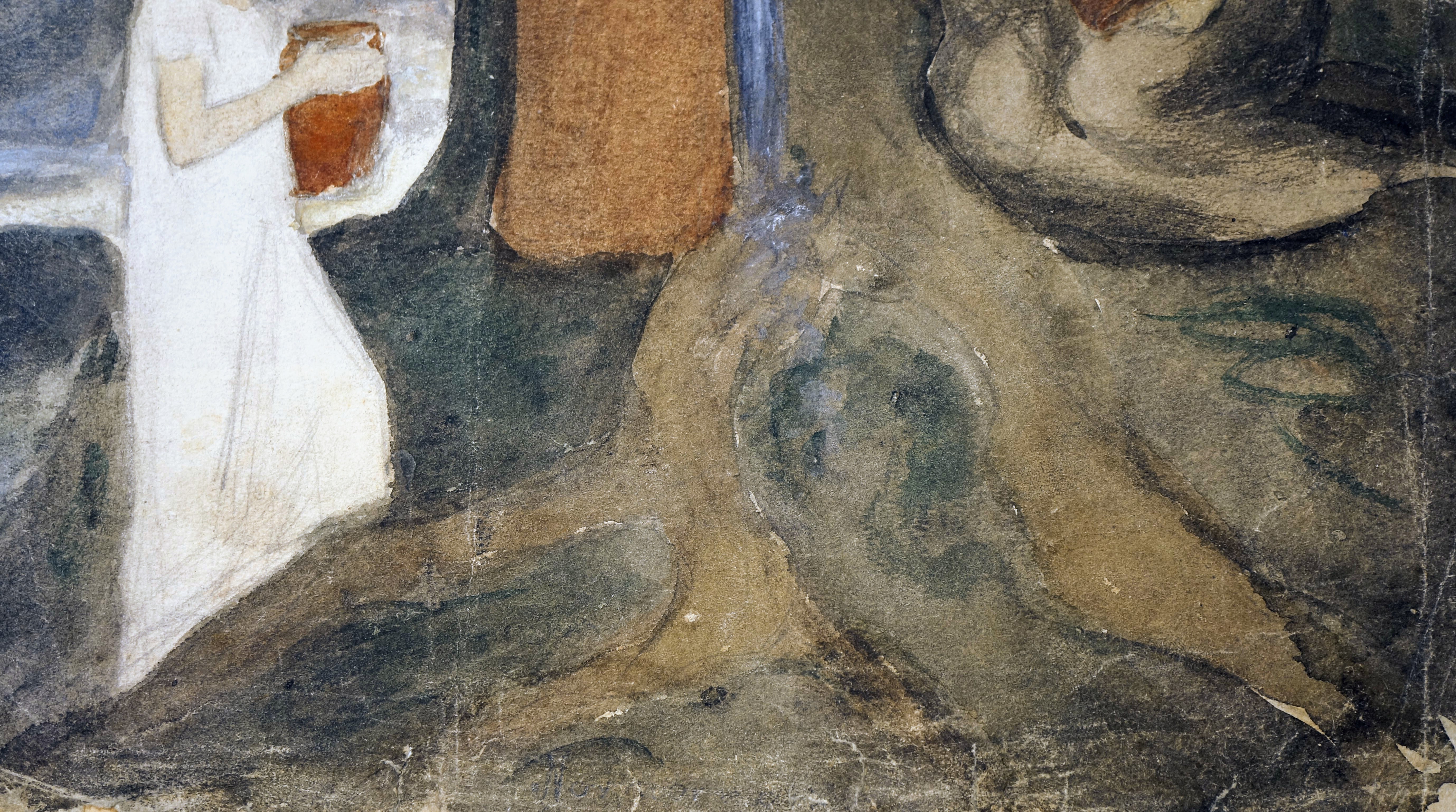 Konservering af tegning af Christian Zahrtmann, 40 x 58 cm., ca.1886. Før konservering, under konservering (detalje, vandmærke) og efter konservering.