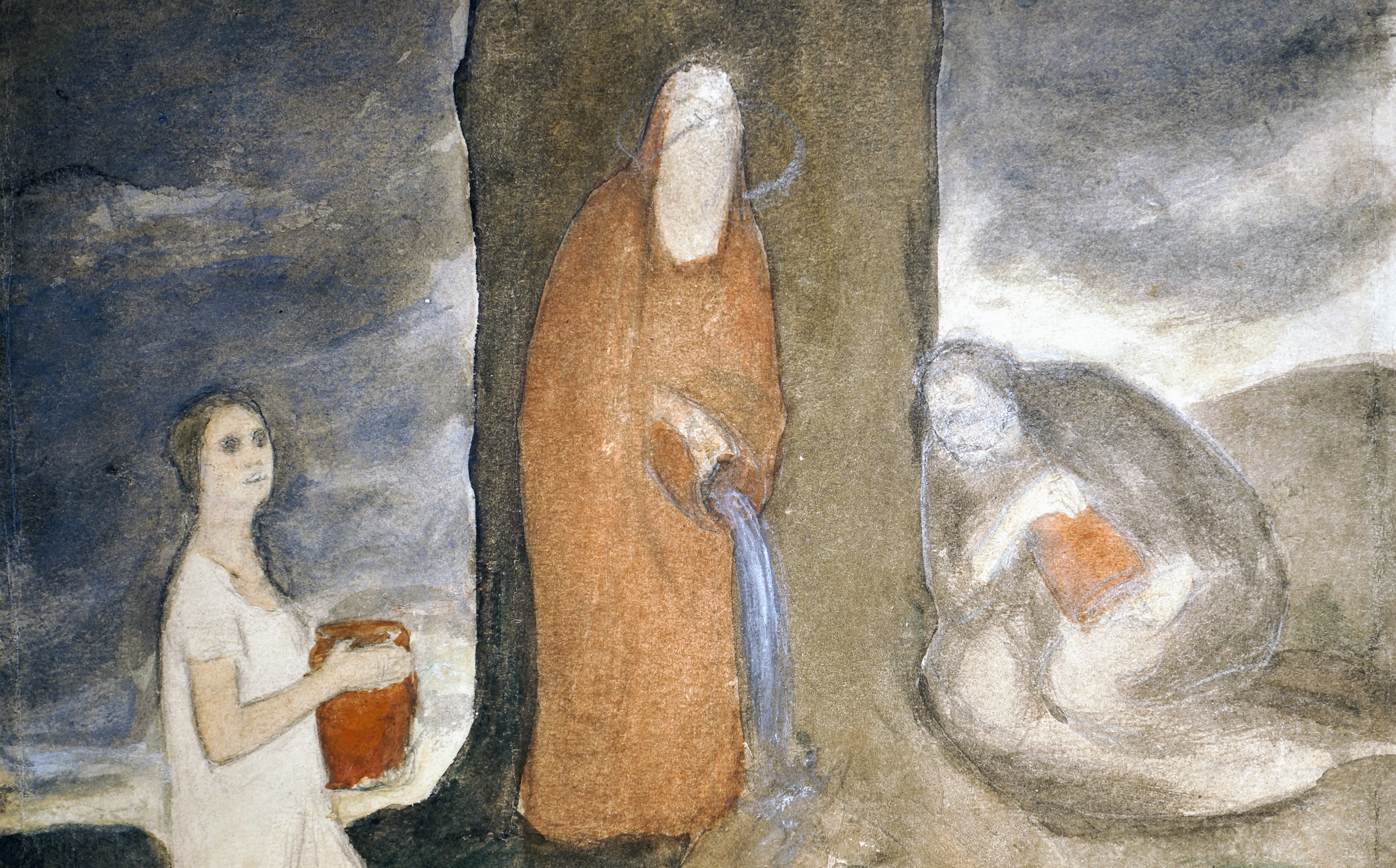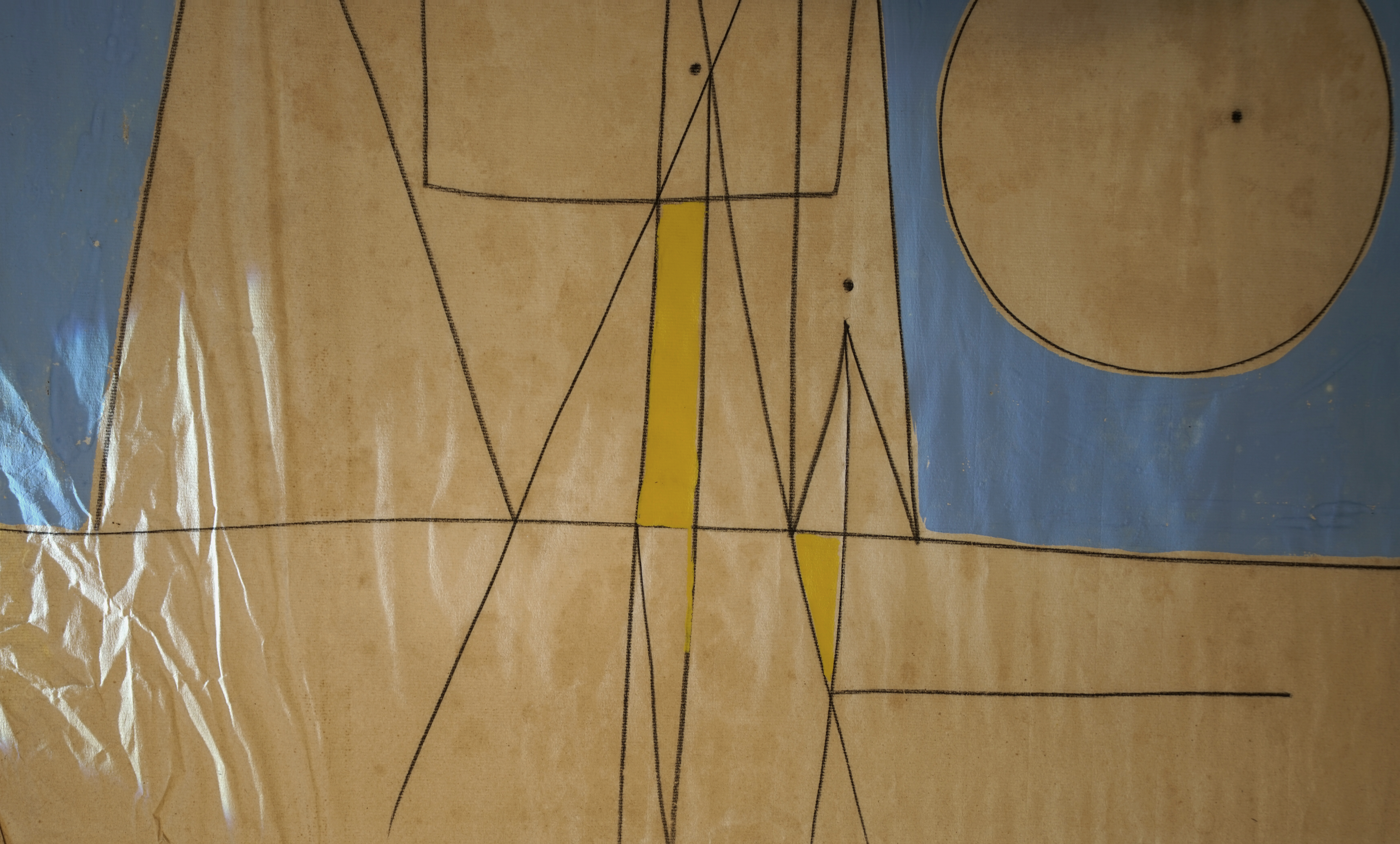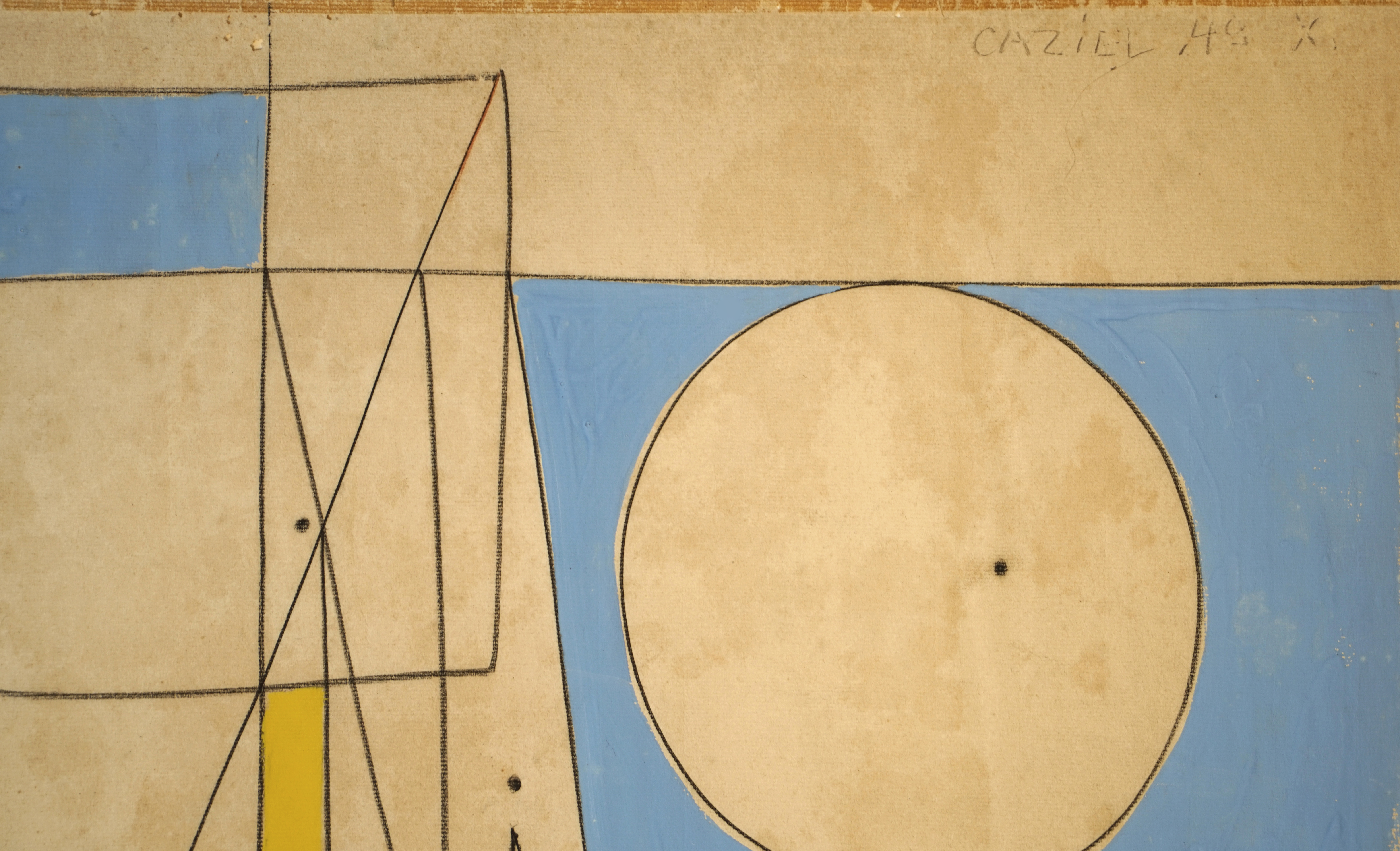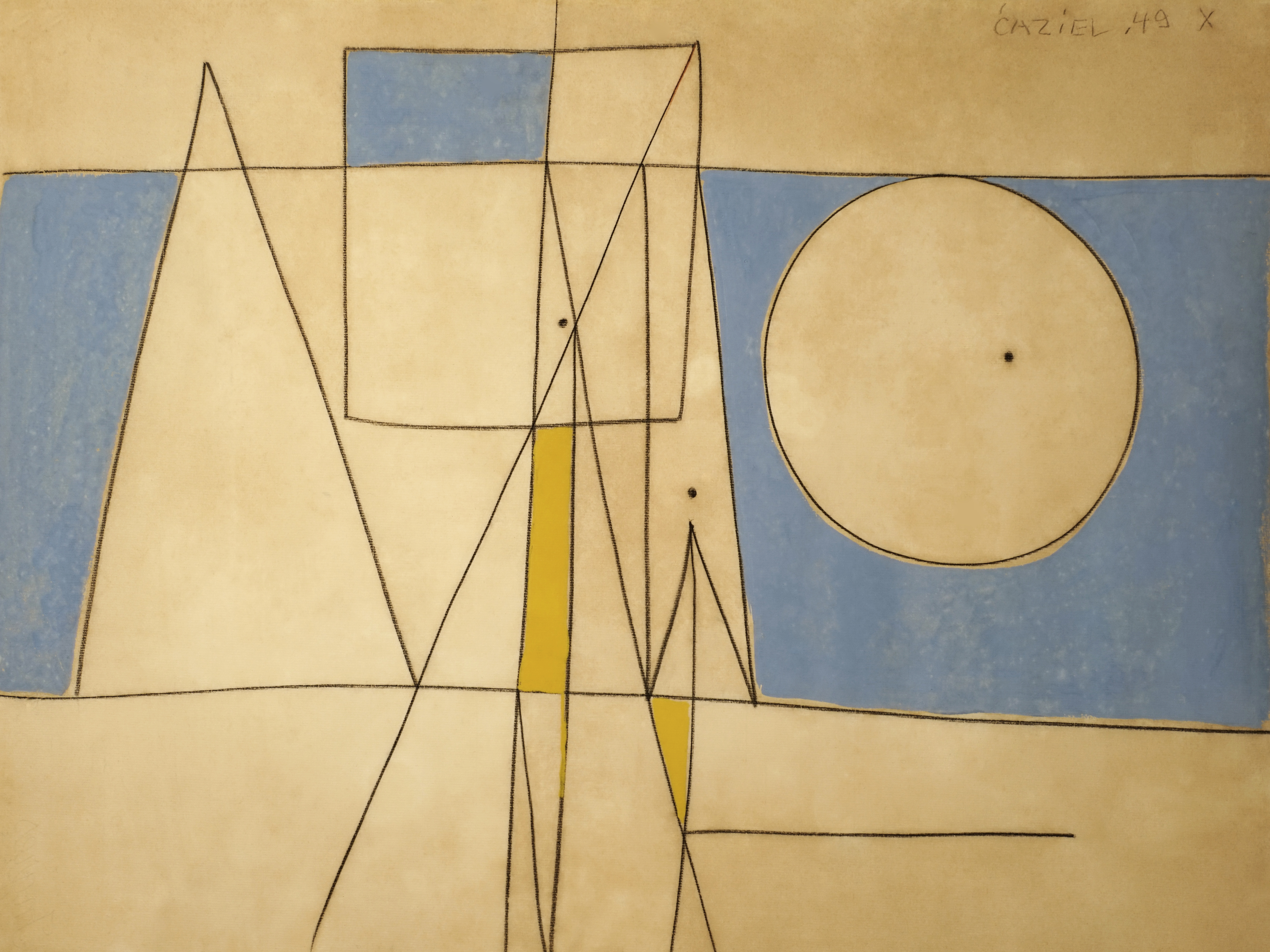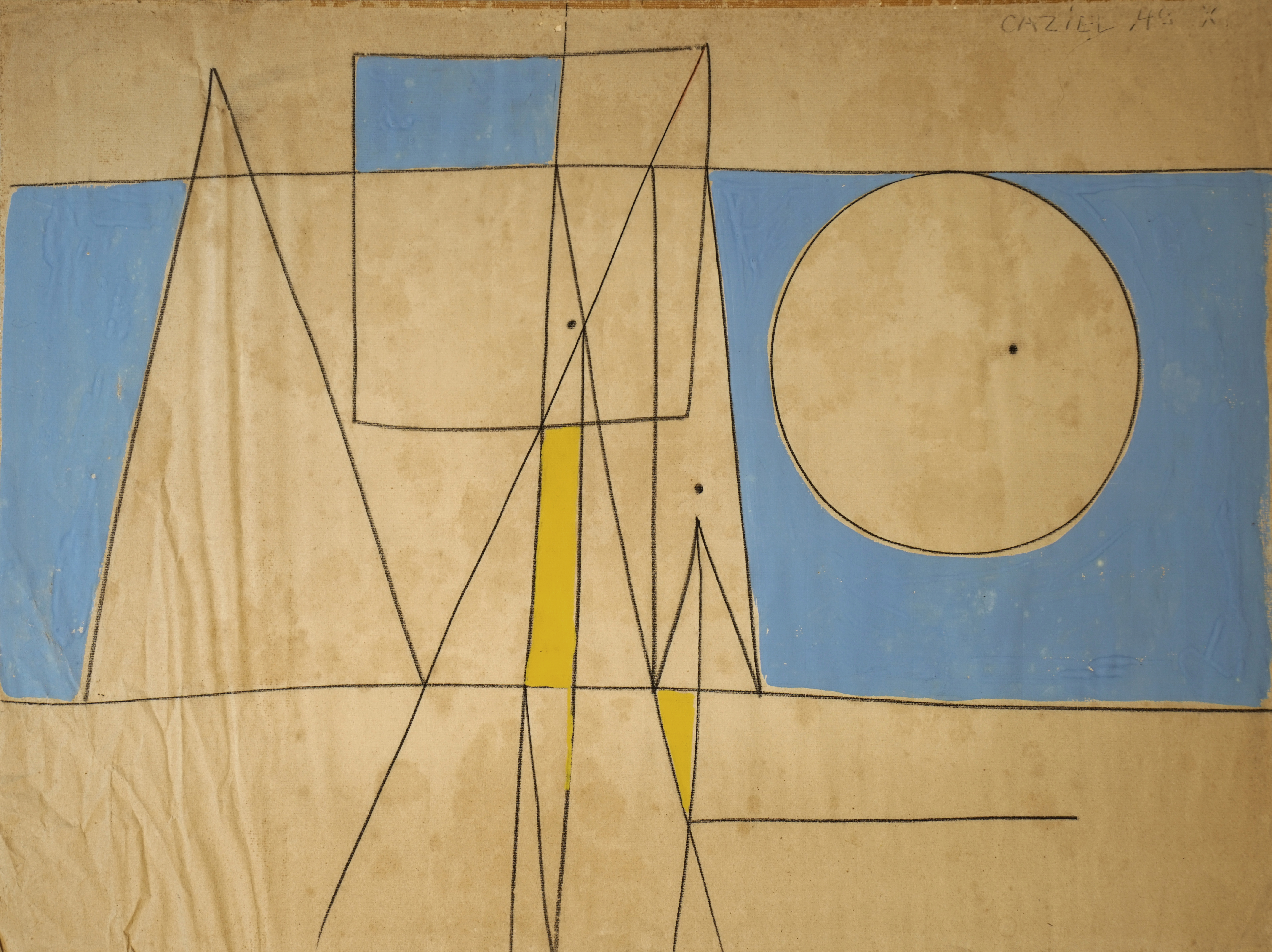 Caziel (Casinoer Zielenkiewic Caziel), Komposition 49.X, 1949. Gouache og kul på papir, 48 x 62,5 cm. Konservering (planering og reduktion af skjolder og misfarvning). Før, under og efter konservering.