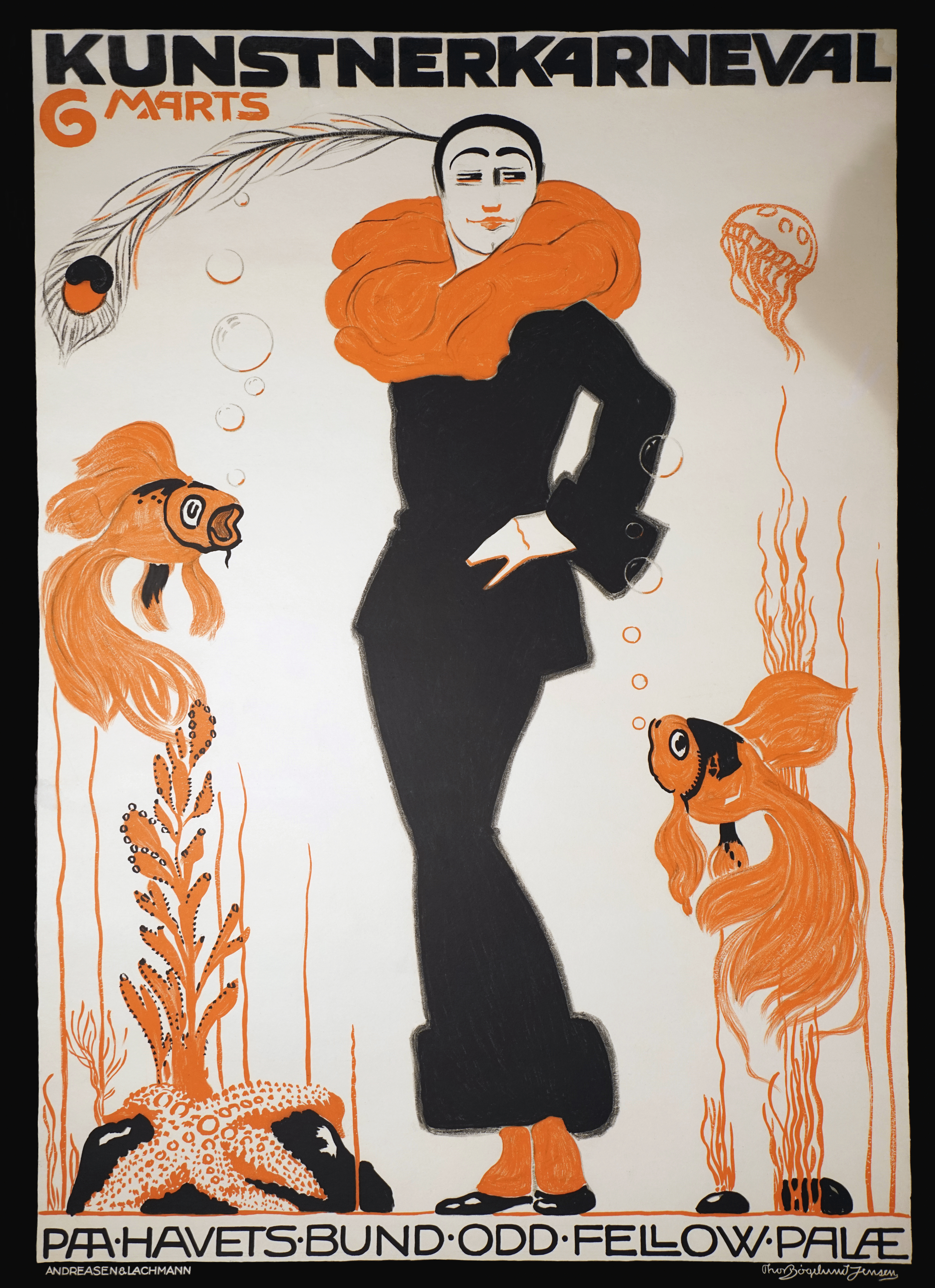 Konservering (og rekonstruktion af manglende dele) af en meget sjælden plakat. Kunstnerkarneval 6. marts 1913. Litografi: 61,5 x 88 cm. Kunstner: Thor Bøgelund Jensen. Tryk: Andreassen & Lachmann.